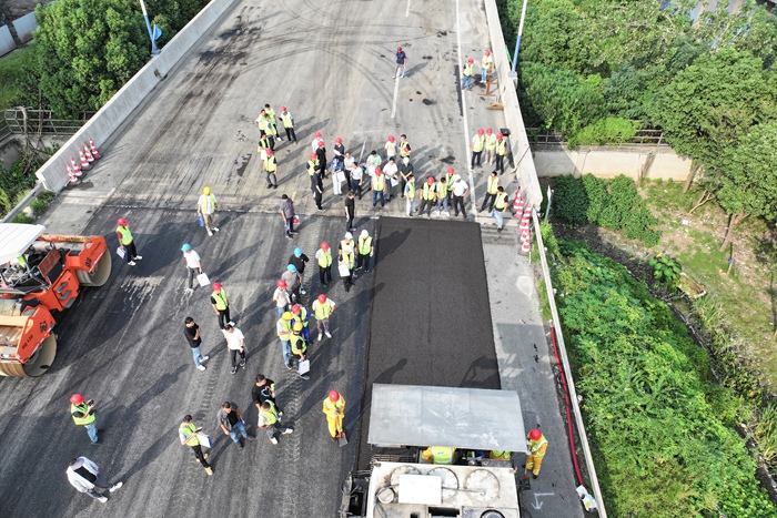 作為本次活動的核心環節,全體人員實地觀摩了由高遠路業進行施工的預防性養護技術現場,直觀了解實際應用效果。在長纖維功能化復合封層技術區域,技術人員講解了該技術如何通過一層找平,兩層抗裂,三層防水為道路建立完善的表面功能。在MOH抗滑超薄磨耗層技術現場,參觀人員對其抗水損、耐磨耗和抗滑性能進行詳細了解。針對車轍、沉陷、龜裂等病害,改性鋪裝技術展示了如何將瀝青混凝土舊路面在常溫條件下改性成復合有機水硬性材料路面。以材料關鍵技術為根本,以成套專用裝備為依托,以當代工程技術為手段,該工藝具有抗變形、防水損、耐老化、長壽命等多重技術優勢。